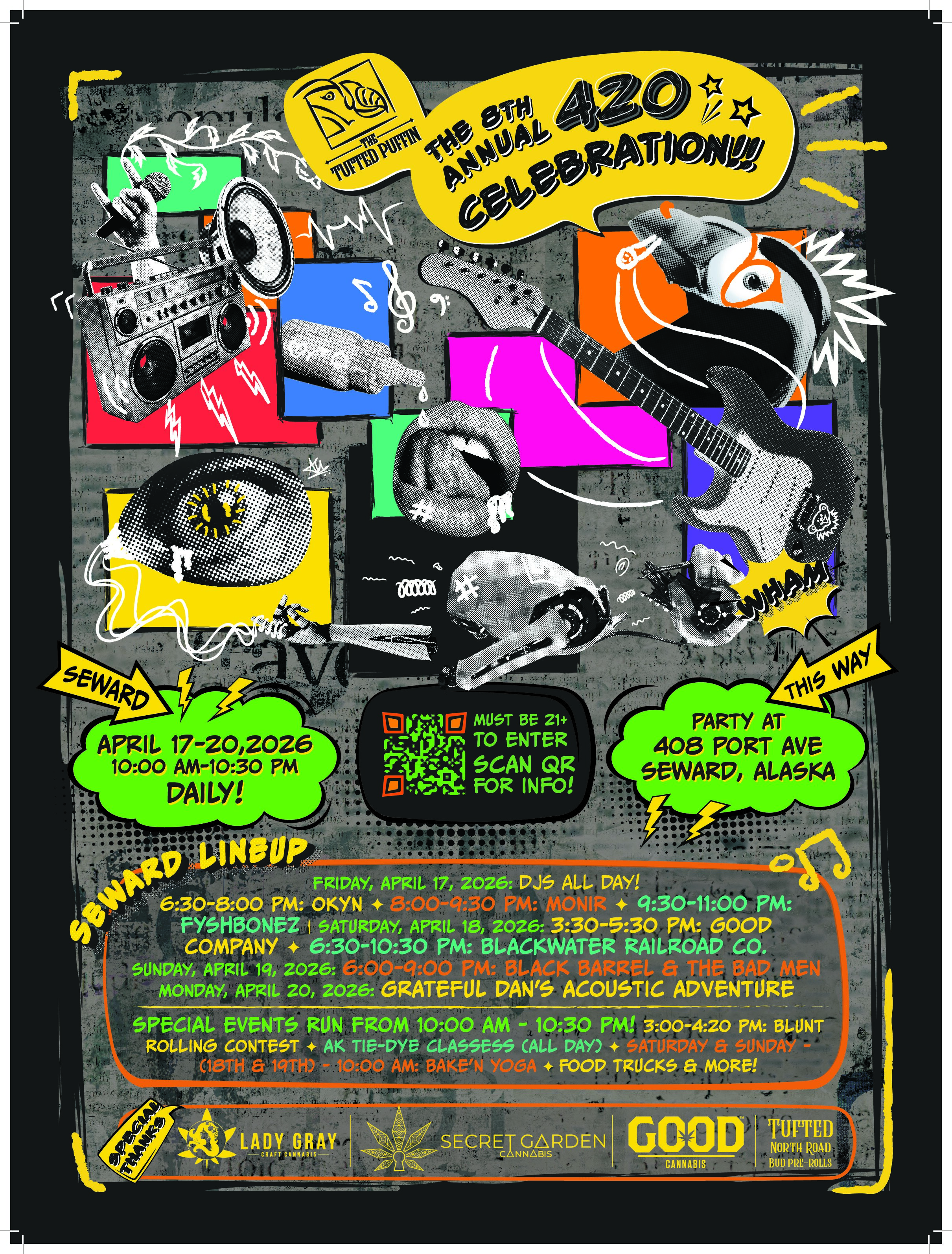 The Tufted Puffin 8th Annual 420 Celebration in Seward. Live DJ's, Bands, Vendors, Food Trucks and more. Ganja Yogan, Blunt Rolling Contest 4/17, 4/18, 4/19, 4/20.